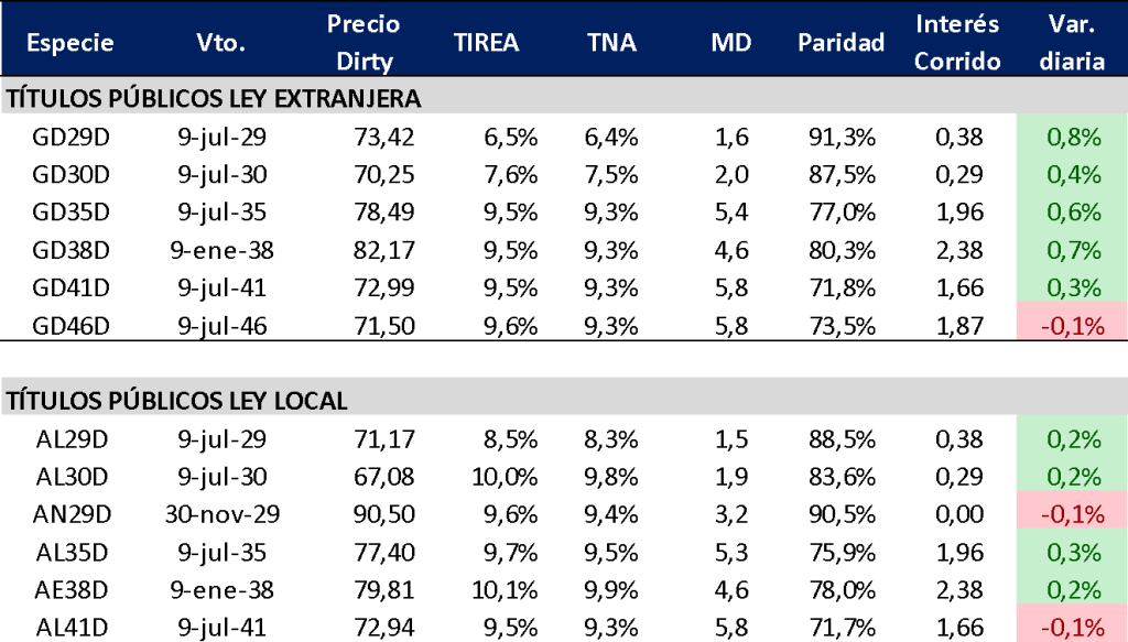 En términos de mercado, el impacto fue moderado pero favorable: se observó una mejora en el margen sobre los activos locales, particularmente en renta fija soberana, con cierta compresión de spreads en los tramos cortos en dólares y mayor estabilidad en los dólares financieros. Sin embargo, la incertidumbre sobre los desequilibrios macro en relación al frente externo y al flujo de dólares persiste, lo que limita una mejora sostenida en las valuaciones.