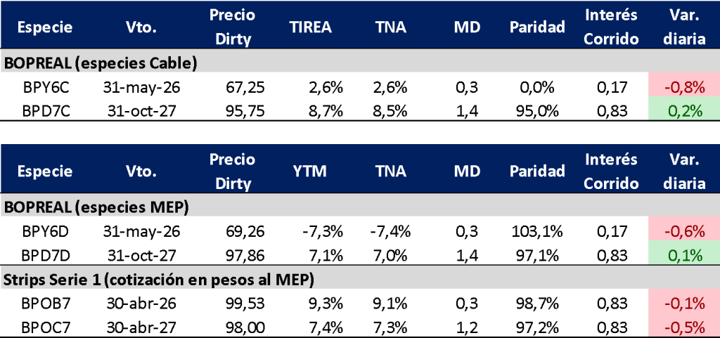 En términos de spreads por curva, la relación AL30D/BPD7D opera por debajo de los 300 pbs., nivel similar al registrado en las últimas ruedas.