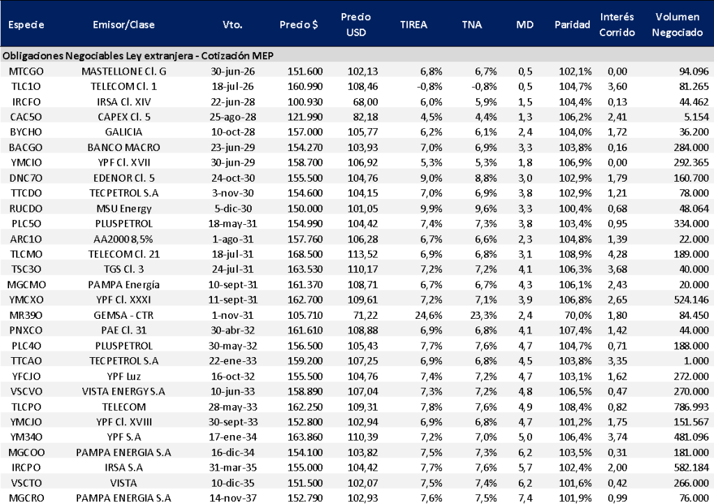 En tanto sobre mercado secundario, la curva con legislación extranjera medida a precios MEP ajustó levemente sobre el tramo largo (vencimientos pos 2031), con una suba promedio en base TIREA de 16 pbs. Los créditos AAA del sector oil & gas continúan operando por debajo de TIREA 7,5%. En tanto sobre el tramo medio los rendimientos son levemente inferiores (rango 5%/7% en función de duration y liquidez de mercado).