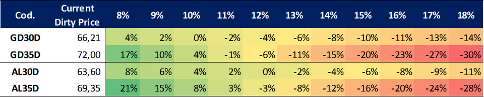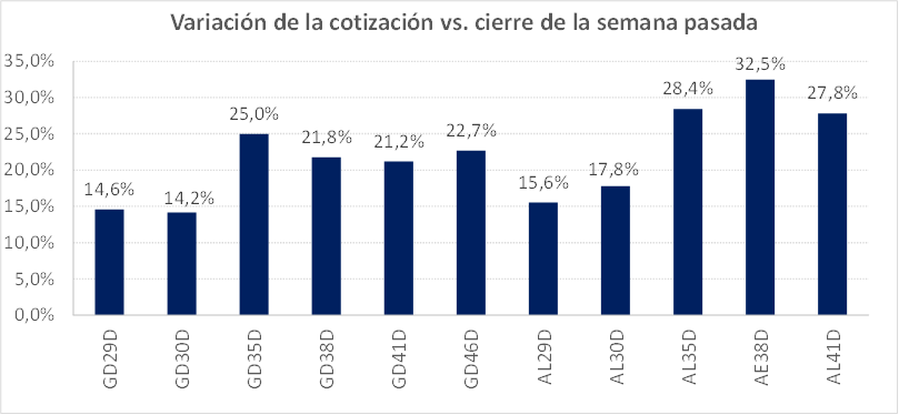 En términos de spreads, la relación AL30D/BPD7D se redujo a 300 pbs., desde los más de 500 pbs. del cierre de la semana pasada.