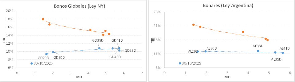 Con estos movimientos, la curva de Globales cerró la última rueda con pendiente positiva (recuperando convexidad) y rendimientos en torno al TIREA 9% en el tramo corto y TIREA 11% en el tramo largo. En el caso de los Bonares, la curva opera desplazada hacia arriba, aún con pendiente levemente negativa y rendimientos en rango 11,8%/11,3%. En este sentido, el spread por legislación (AL30/GD30) volvió a reducirse y cerró en 200 pbs en base TIREA.