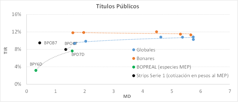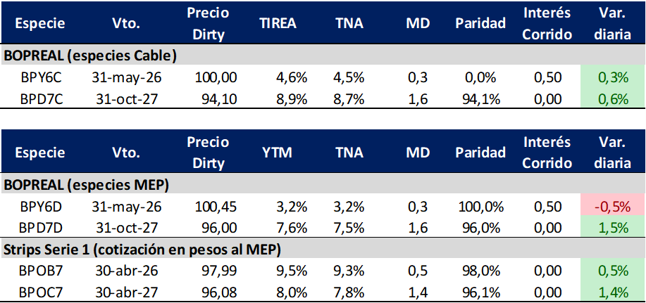La curva Bopreal bajo cotización MEP también comprimió rendimientos de la mano del cambio de expectativas. El título corto con vencimiento mayo de 2026 (BPY6D) se mantiene operando con rendimiento positivo, prácticamente a valor par. Dado que vence en mayo del año próximo no se ve tan afectado por la volatilidad de mercado. En términos de subordinación temporal, es el primero de todo el universo de bonos del gobierno y BCRA en amortizar completamente.