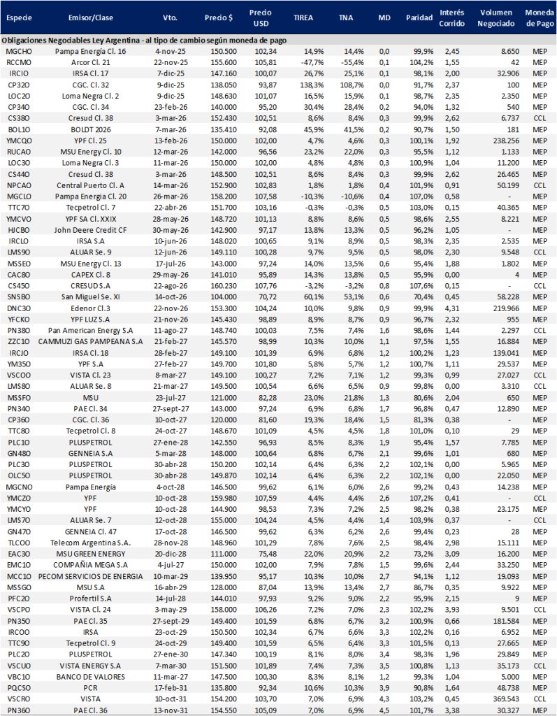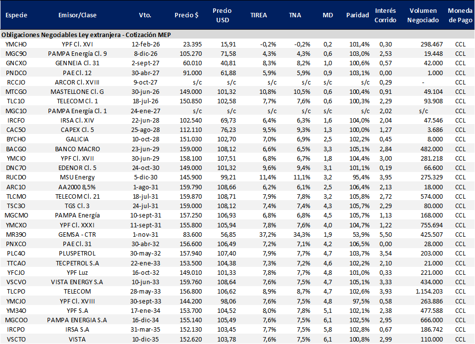 En tanto la curva de ONs Ley Local continúa operando con mayor volatilidad y rendimientos más alineados a la curva Ley extranjera. Sin embargo, el volumen y profundidad de mercado son mucho menores, incluso en emisiones AAA, lo que debería agregar una prima por iliquidez en el análisis comparativo. En el tramo largo, luce atractivo Pluspetrol (PLC2O), que en la última rueda cerró en TIREA 8,1% y vencimiento enero de 2030. En el panorama de ofertas primarias, como comentábamos previamente, anticipamos una oleada de emisiones hard dollar, en especial del sector energético. En la semana, Tecpetrol colocó USD 750 millones a 5 años en los mercados internacionales, a una tasa del 7,625% anual.