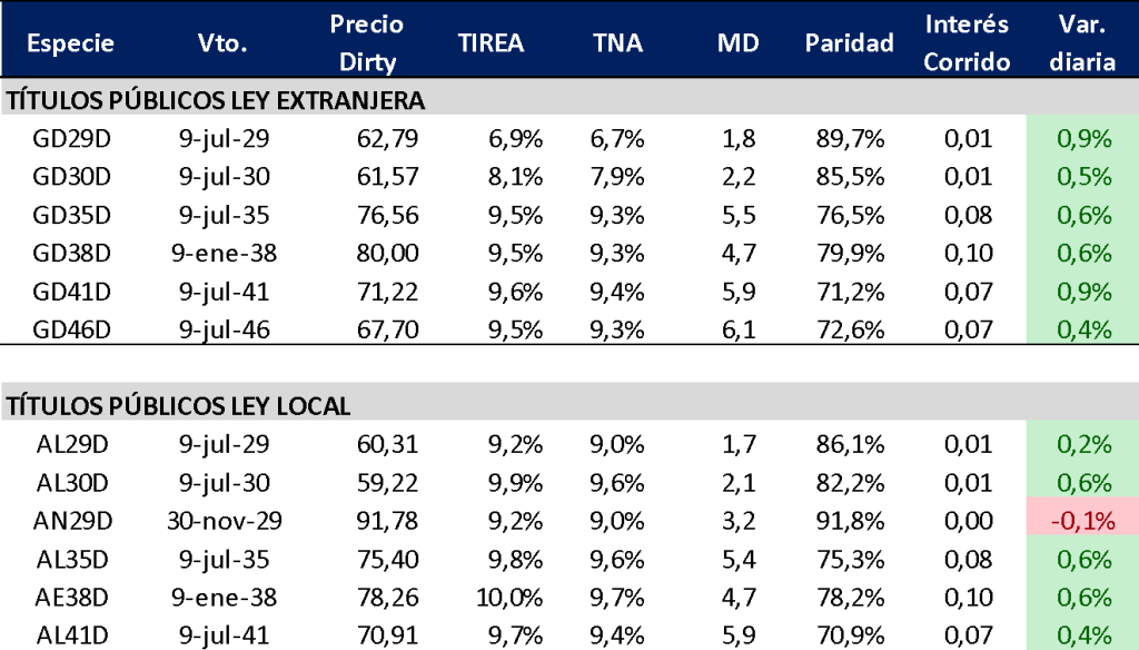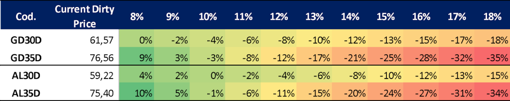 En términos de análisis relativo y teniendo en cuenta esto último, continuamos ponderando los bonos más cortos (vencimientos 2029, 2030), con menor pérdida potencial ante una profundización del escenario negativo.