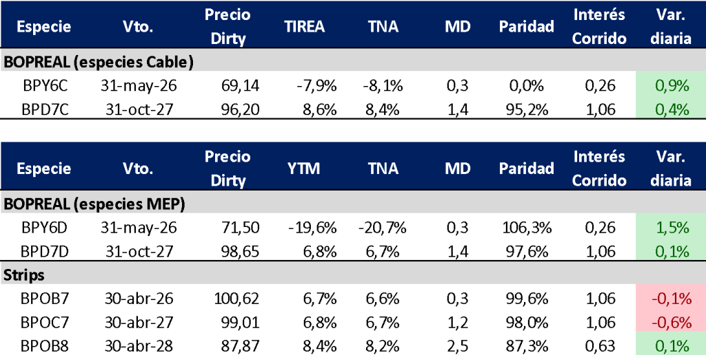 La curva Bopreal operó dispar entre sus puntos, aunque sin grandes movimientos. El BPD7D, con vencimiento octubre de 2027, cerró la última rueda en TIREA 6,8% (+30 pbs. en base TIREA respecto al viernes pasado).