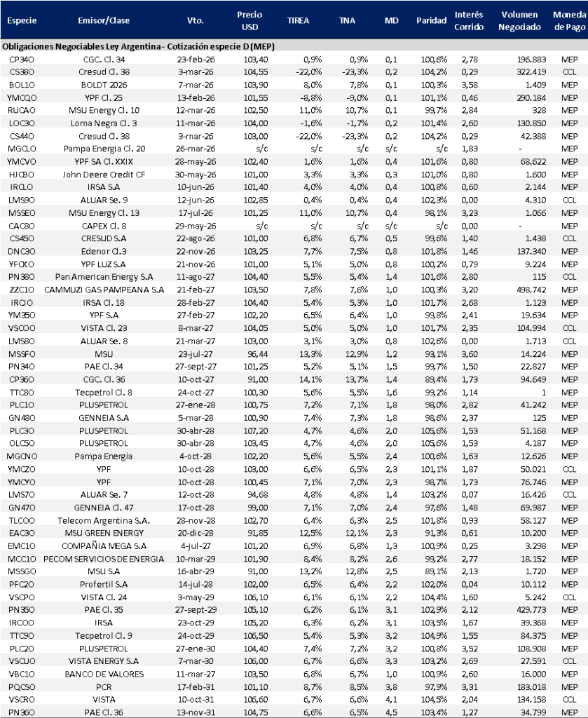 En el mercado secundario las curvas corporativas en dólares cerraron una semana sin grandes movimientos. La curva de bonos con legislación extranjera mostró una leve compresión en el tramo más corto, que actualmente rinde en torno a TIREA 6%, e incluso presenta algunos bonos con rendimientos cercanos a TIREA 4% en vencimientos de muy corto plazo. En el tramo más largo, los rendimientos se mantienen alrededor de TIREA 7,5%, incluso con algunos créditos AAA del sector oil & gas operando por debajo.