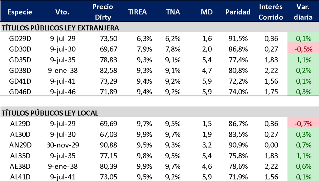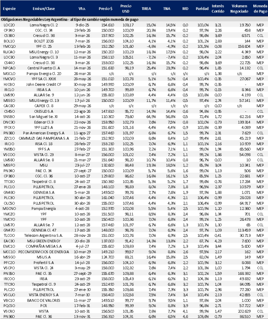 Semana de fuertes subas sobre ambas curvas hard dollar del Tesoro tras los anuncios del BCRA (+3,5% promedio en Globales y +2,9% en Bonares), en especial sobre los títulos largos. Otra noticia positiva de la semana: la mejora en la calificación de la deuda soberana por parte de S&P. La agencia elevó la nota de largo plazo de Argentina a CCC+ con perspectiva estable, destacando la consolidación del superávit fiscal, la desaceleración inflacionaria y una posición política más sólida del Gobierno, factores que reducen la probabilidad de un evento de default en el corto plazo.