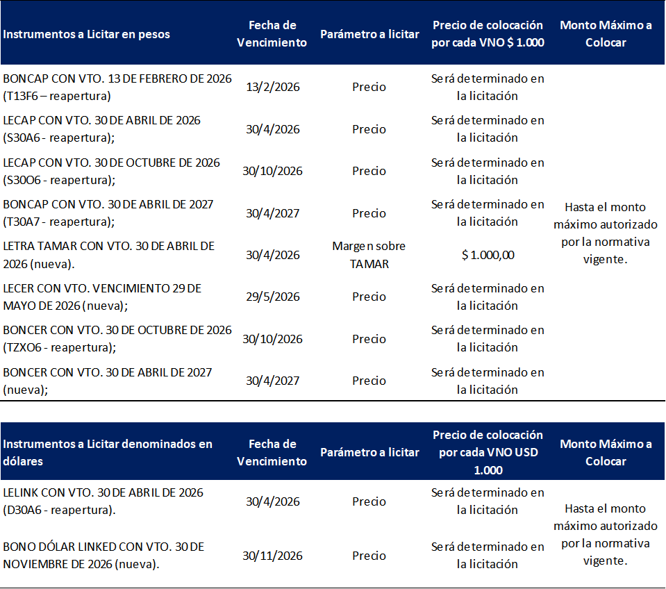 En relación a la licitación, la especie más corta ofrecida tiene 77 días de vencimiento (T13F6), por debajo del plazo mínimo de 109 días de la última licitación. Además, la Secretaría ofrece 3 especies a tasa fija adicionales, con vencimientos en abril, octubre de 2026 y abril de 2027 (153, 336 y 518 días, respectivamente).