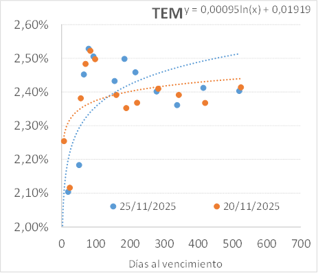 La recepción de las ofertas de todos los instrumentos comenzará a las 10:00 horas y finalizará a las 15:00 horas del día miércoles 26 de noviembre de 2025 (T) y la liquidación de las ofertas recibidas y adjudicadas se efectuará el día viernes 28 de noviembre de 2025 (T+2). –ver llamado-.