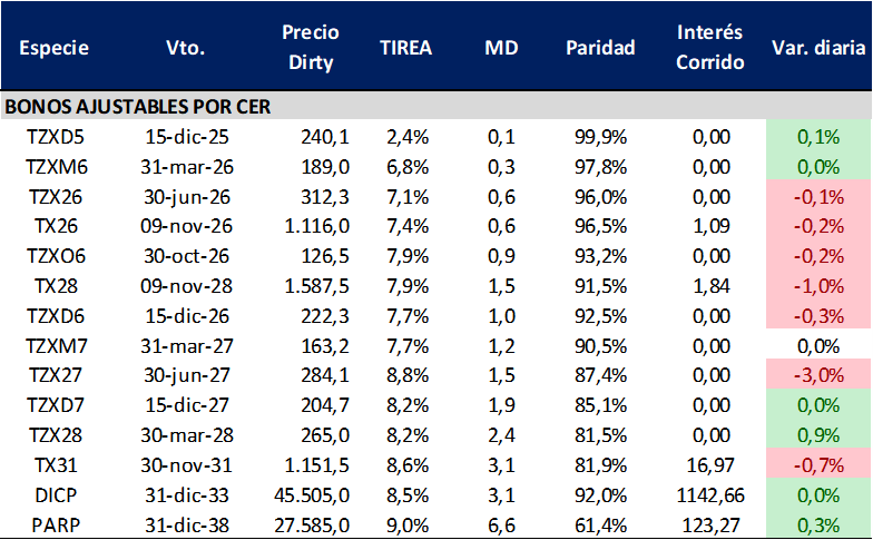 La curva CER continúa operando con mayor atractivo y tasas reales que se ubican en torno a 7%/7,7% en el tramo corto/medio de la curva y en torno a 8,5%/9% en los bonos más largos.