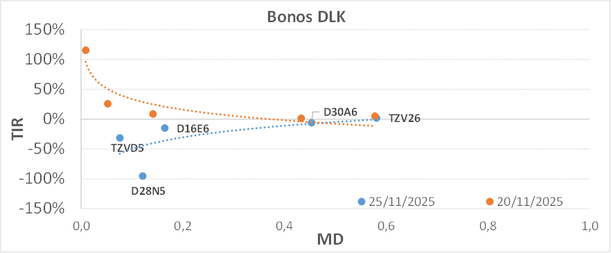 Esta licitación será buena medida para evaluar el interés relativo en instrumentos de cobertura dólar linked, en un contexto de compresión de tasas en pesos. Gran parte de las tenencias privadas de la D28N5 fueron adquiridas en la previa a la elección de medio término, con lo cual es esperable que no se renueve la totalidad del vencimiento en este tipo de ajuste. El Tesoro ofrece dos instrumentos, con vencimiento en abril (D30A6) y noviembre de 2026 (nueva).