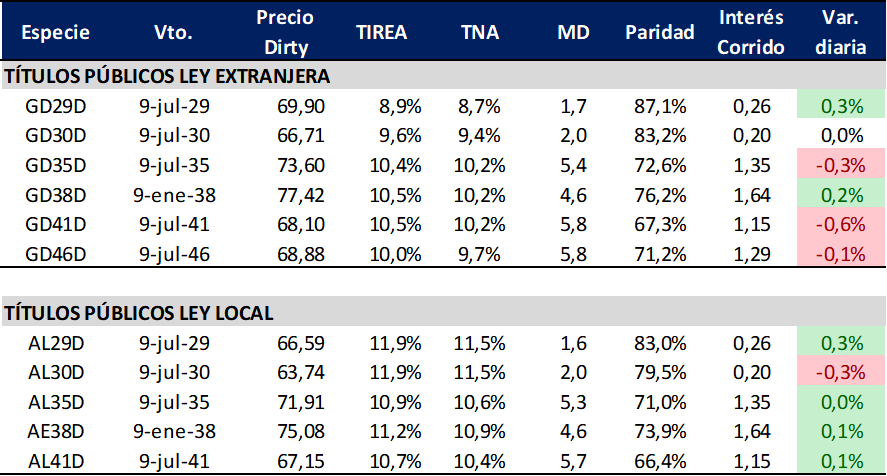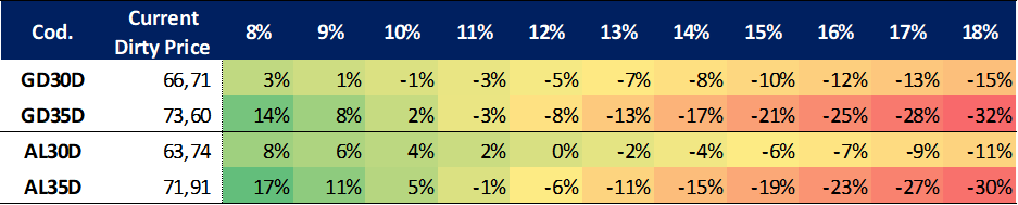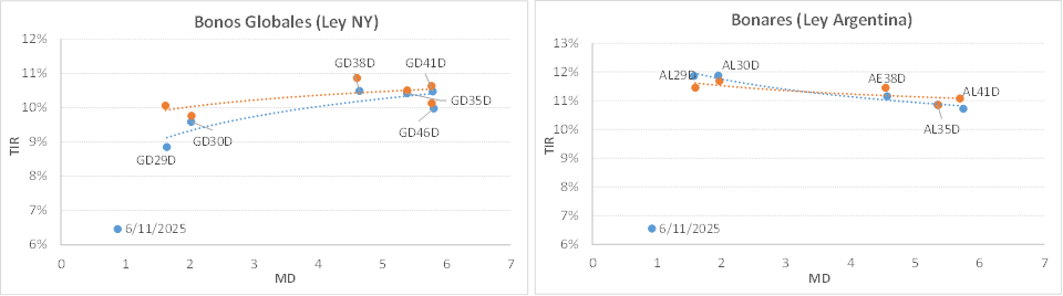 En este escenario, la curva de Globales ya opera con pendiente positiva marcada y rendimientos en torno al TIREA 9% en el tramo corto y TIREA 10,5% en el tramo largo. En el caso de los Bonares, la curva continúa desplazada hacia arriba, aún con pendiente levemente negativa y rendimientos en rango 11,9%/10,7%. El spread por legislación (AL30/GD30) se amplió por la mejor performance de la curva ley extranjera y cerró en 229 pbs en base TIREA (+37 pbs. al cierre de la semana pasada).