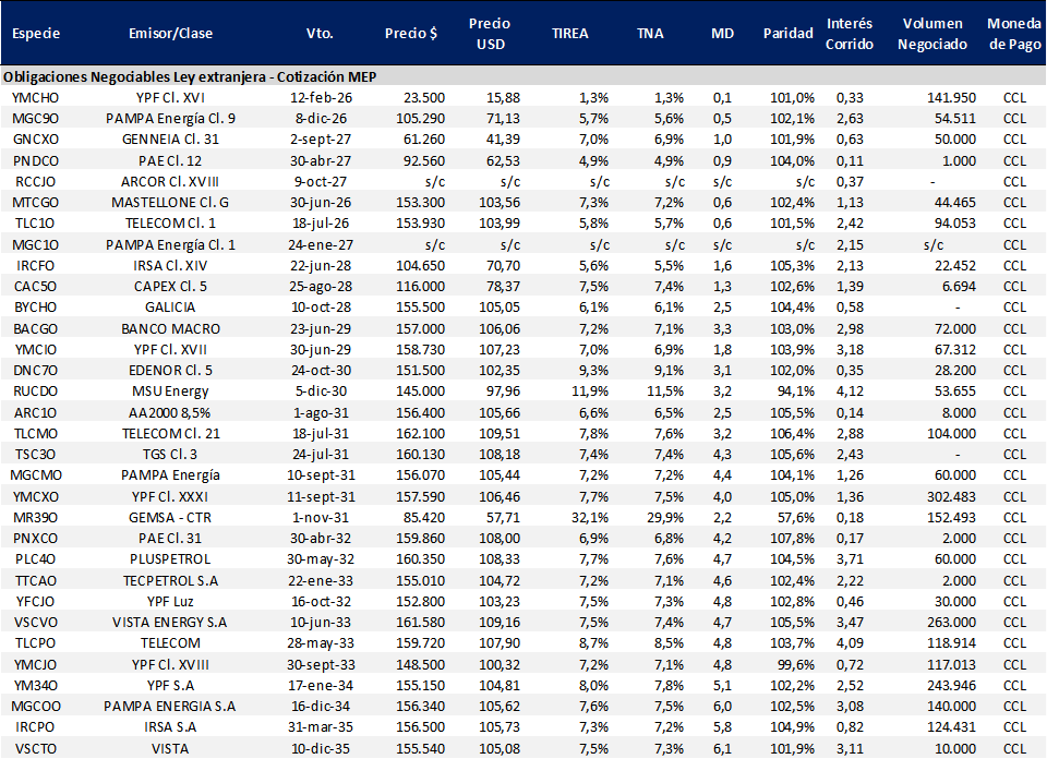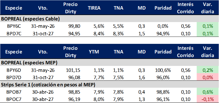 La curva Bopreal bajo cotización MEP incrementó levemente rendimientos en comparación del cierre de la semana pasada, con el título corto con vencimiento mayo de 2026 (BPY6D) operando prácticamente a valor par y TIREA 1,1%. En tanto el título largo (BPD7D), con vencimiento octubre de 2027 cerró en TIREA 7,7%, nivel similar a los strips B y C: 7,9% y 8,0%, respectivamente.