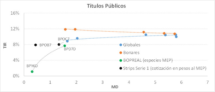 En el análisis relativo, la curva Bopreales continúa bastante por debajo de la curva de Bonares, con rendimientos más en línea con los títulos corporativos. En estos niveles sostenemos el poco atractivo para ingresar a la curva sobre apuestas que busquen ganancia de capital. En tanto sobre una estrategia más conservadora que busque devengar tasa, ponderamos lo strips B y C que operan por encima de la curva interpolada valuados a la fecha de ejercicio de la opción.