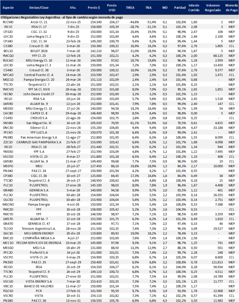 En tanto la curva de ONs Ley Local continúa operando con mayor volatilidad, en especial sobre créditos más riesgosos con rendimientos que oscilan entre 100/200 pbs. Nuevamente destacamos que el volumen y profundidad de mercado en este tipo de instrumentos son mucho menores. En el tramo medio, luce atractivo Pluspetrol (PLC1O), que en la última rueda cerró en TIREA 8,0% y vencimiento enero de 2028. Para este tipo de operaciones, sobre activos menos líquidos pueden aparecer oportunidades de arbitrajes específicos. En el panorama de ofertas primarias de la semana, se destacó la emisión de Banco Comafi S.A con la ON clase XVII por un monto de USD 38 millones con cupón de 6,5% y plazo de 12 meses.