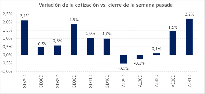 En términos de spreads, la relación AL30D/BPD7D se mantiene operando en rango 300/400 pbs. En la rueda del jueves cerró en 344 pbs (-40 pbs. en la comparativa semanal).