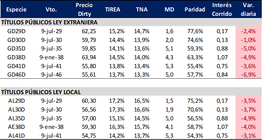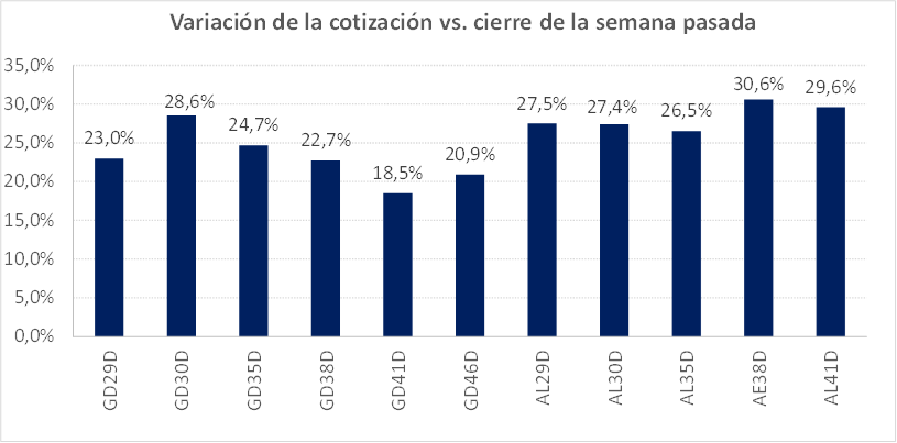 La semana cierra con los bonos soberanos operando a la baja, pero con subas muy fuertes en el acumulado, que alcanzan hasta el +30% en el tramo largo de la curva ley local. Con esta recuperación, las cotizaciones volvieron a niveles similares a los registrados días previos a la elección de PBA de septiembre.