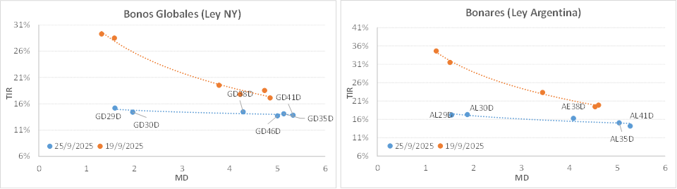 Con estos movimientos, la curva de Globales comprimió fuertemente rendimientos, cerrando la rueda del jueves en torno a TIREA 15% en el tramo corto y TIREA 13% en el tramo largo. En el caso de los Bonares, la curva también acompañó la compresión, aunque dejando algo más pronunciada la pendiente negativa por el riesgo de legislación. En el tramo corto, el AL29 rinde TIREA 17% y los plazos más largos alrededor del TIREA 15%. El spread por legislación (AL30/GD30) ajustó levemente a la baja respecto a la semana previa y cerró en 288 pbs de TIREA. En tanto el riesgo país volvió a romper el piso de los 1.000 puntos y cierra el jueves en torno a los 950 pbs.