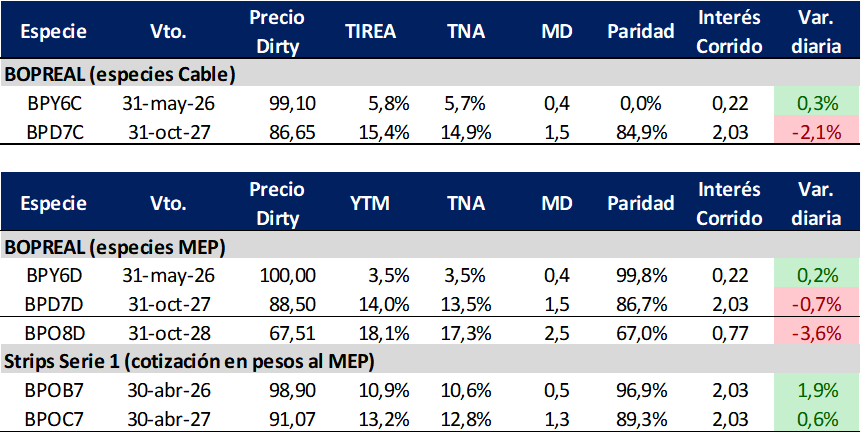 El título corto con vencimiento mayo de 2026 (BPY6D) cerró con rendimiento en base TIREA de 3,5% por sensibilidad precio/tasa dado su próximo vencimiento. En términos de precio, cayó 3,5% en el acumulado semanal. En tanto el título largo (BPD7D), con vencimiento octubre de 2027 cerró en TIREA 14%, comprimiendo 850 pbs. respecto de los niveles del viernes pasado (piso de mercado).