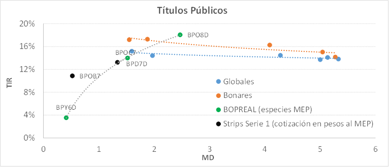 En el análisis relativo, seguimos ponderando instrumentos cortos o con cláusula de rescate anticipado en favor del tenedor, como los strips B y C (abril del año próximo para el B y abril de 2027 para el C). En una estrategia más agresiva, con vencimiento más largo, ponderamos el BPD7D.