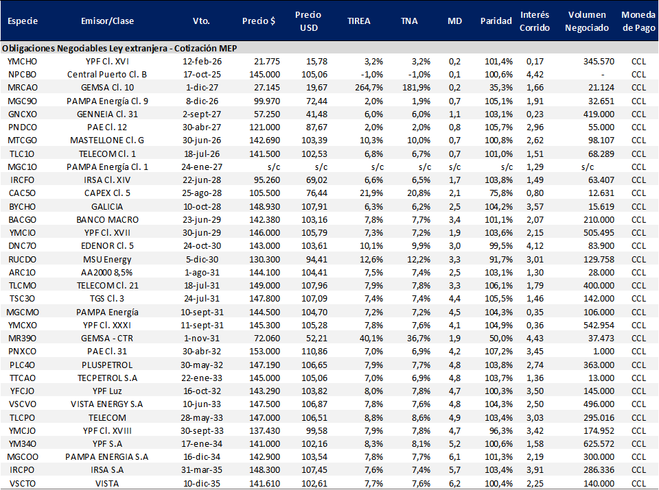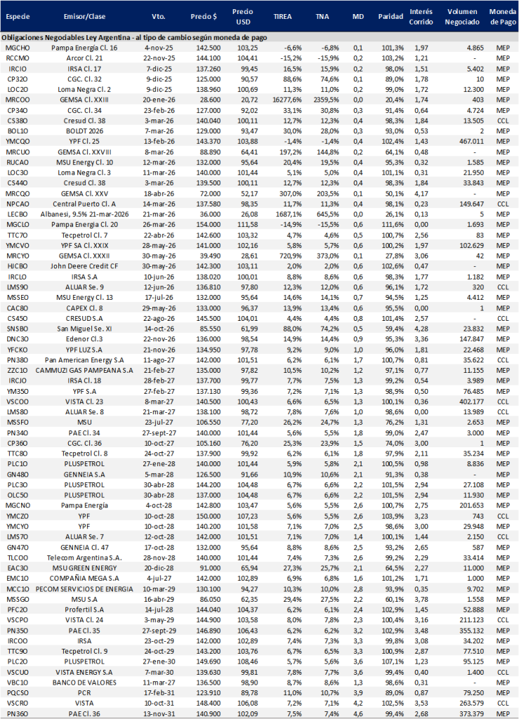 En tanto la curva de ONs Ley Local opera con mayor volatilidad, muy desarbitrada en función del perfil de crédito, comprimiendo incluso sobre algunos AAA que operan con rendimientos cortos en rango 4%/6%, tasas aún menos atractivas. En tanto las empresas más riesgosas registran rendimientos por encima de TIREA 20%/30%.