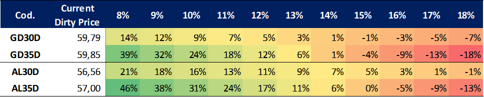 En el análisis relativo, sobre una estrategia agresiva que apunte a la fuerte compresión del riesgo país, lucen más atractivos las especies del tramo largo (GD35, GD38 y GD41).